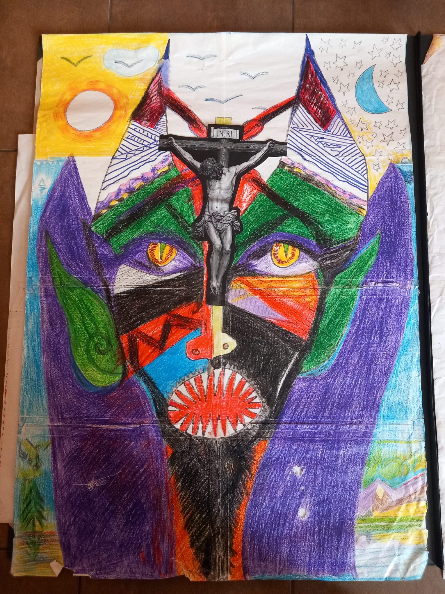 Serie de dibujos en folios pegados con celo para conseguir distintos tamaños y presentado en sándwich entre dos cristales y con marco metálico blanco. Plastidecor, lápiz, colores….
